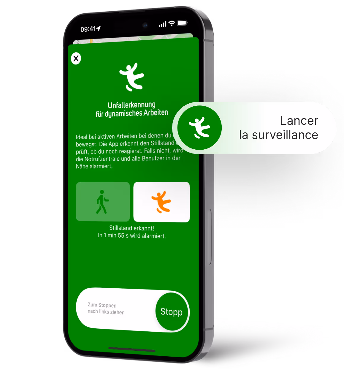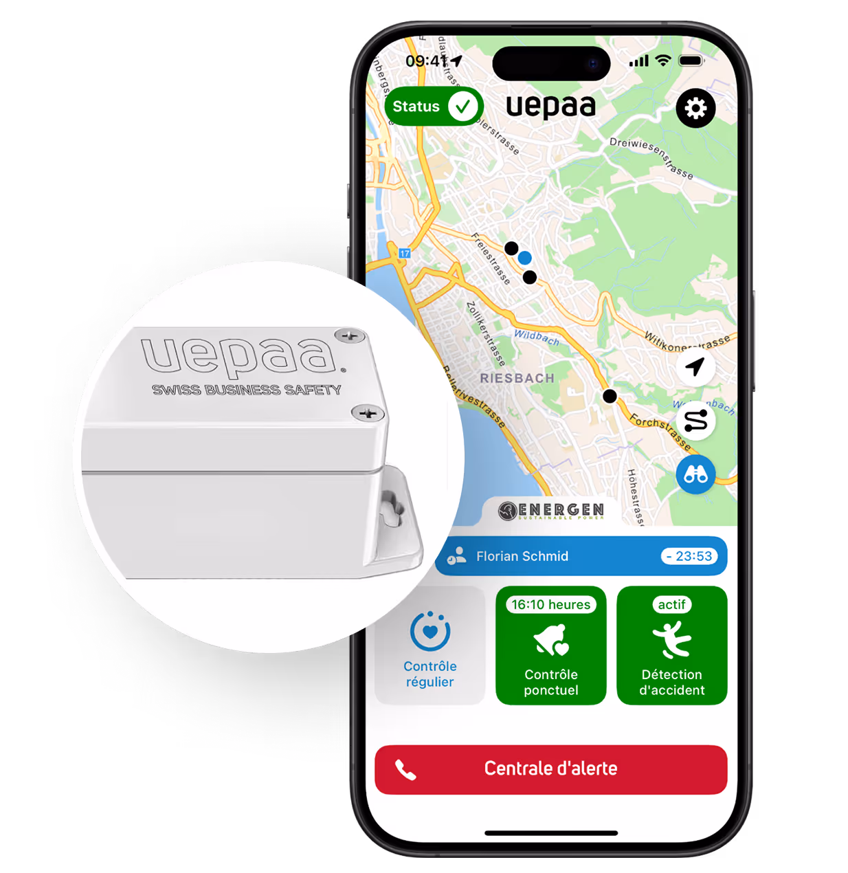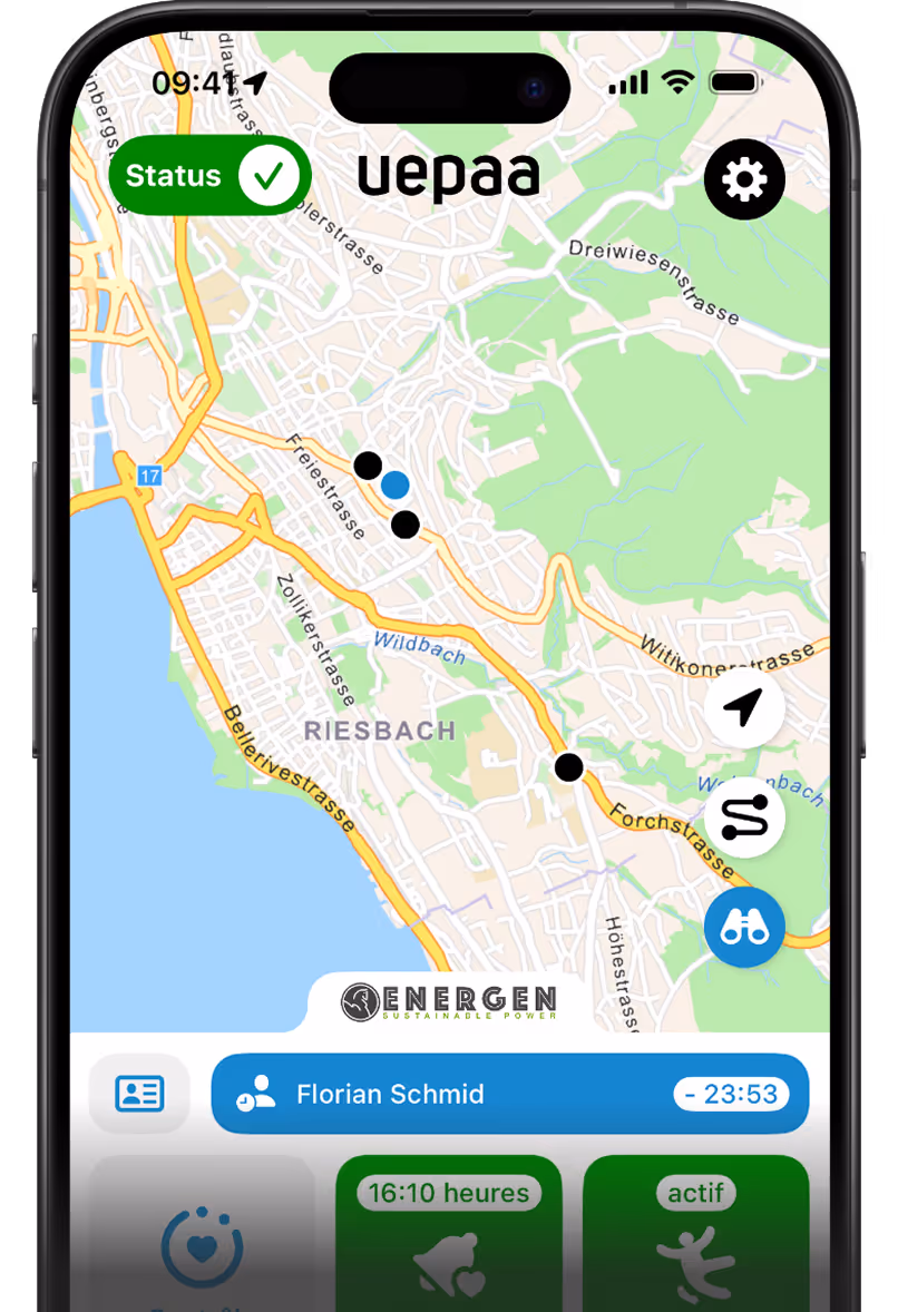 L'application Dead Man alerte lorsque l'employé n'est plus en mesure de le faire. Uepaa combine des capteurs horlogers de pointe, des fonctions de minuterie intelligentes et une connexion fluide à un centre d'appels d'urgence 24h/24 et 7j/7.